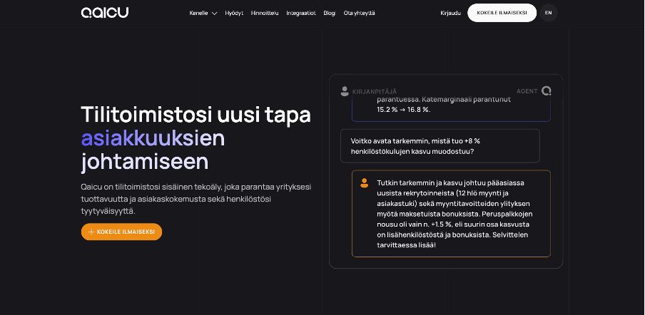 Tavoitteemme on, että Qaicu toimii tilitoimiston omana personoituna asiakaskäyttöliittymänä, johon keskitetään asiakkaiden talousviestintä aina raportoinnista päivittäiseen viestintään: Kirjanpitäjä näkee Qaicun kumppanialustalla kaikki omat asiakkaansa, näiden tehtävät ja häneen liitetyt keskustelut. Qaicu tuottaa asiakkaalle kuukausiraportoinnin ja vastaukset päivittäisiin kysymyksiin Chatin kautta ilman kirjanpitäjän työn keskeyttämistä.
