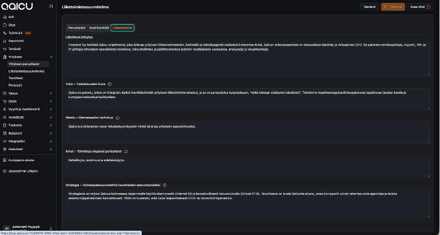 Kun Qaicun käyttöönoton vaiheet on suoritettu, tilitoimiston tekoäly on käyttövalmis. Voit aloittaa lisätietojen opettamisen ja kysymysten esittämisen. Lisätietojen opettaminen on vapaaehtoista, mutta Qaicua opettamalla vastaukset paranevat askel askeleelta.