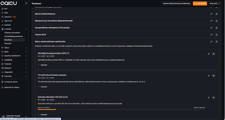 Qaicun avulla tilitoimisto voi tarjota tavoitejohtamisen teoriaan (OKR) perustuvaa liiketoimintasuunnittelua. Avaintulosten etenemistä voidaan seurata tehtävien ja avaintuloksiin kiinnitettyjen tunnuslukujen kautta.